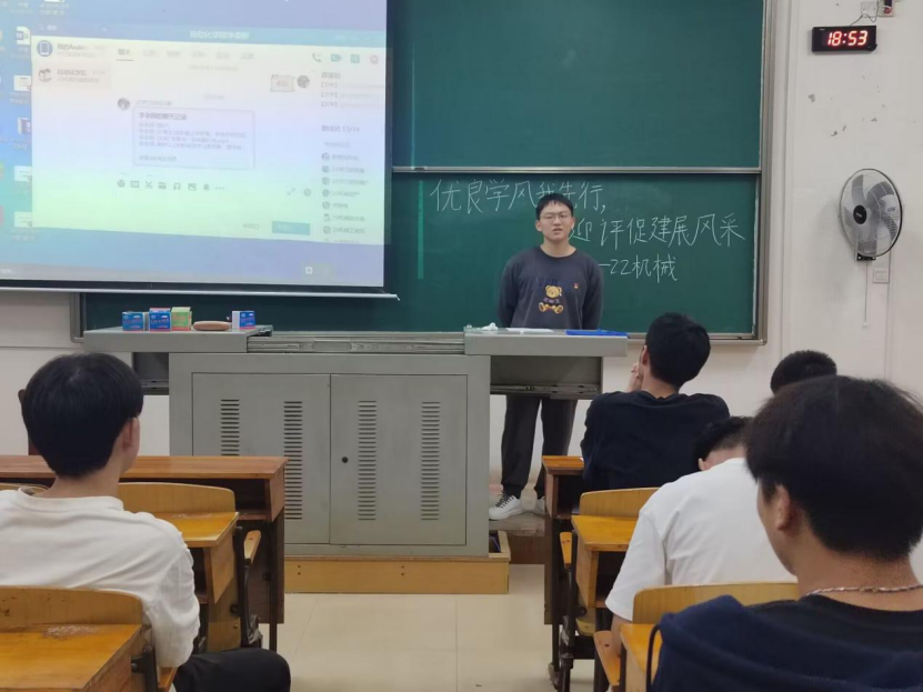 班会伊始,各班班干部通过PPT,视频等形式,从学风建设要求、文明礼仪教育等方面进行重点讲解,强调“三早、五不准”,要求同学们增强自我管理意识,提高自我管理能力,帮助同学们逐步养成良好的学习习惯和生活习惯。努力打造优良的班风学风,彰显班级凝聚力,竞显个人风采。