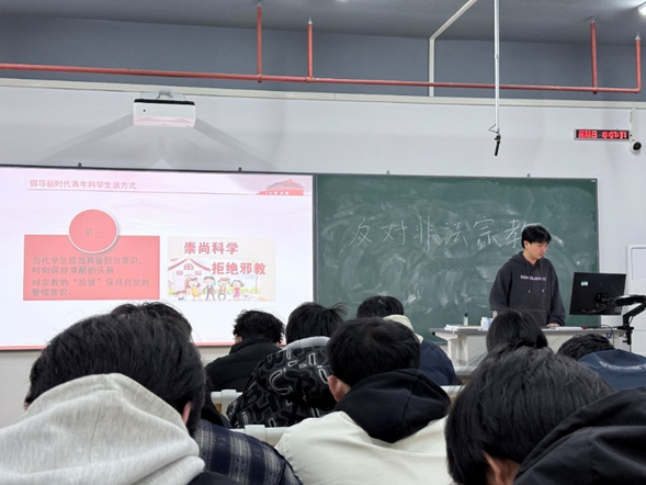 班会围绕什么是非法宗教活动、非法宗教渗透的危害、倡导新时代科学生活方式三大核心内容展开。各班班长先明晰了宗教与非法宗教的本质区别,介绍我国合法的五大宗教,界定非法宗教及非法宗教活动的具体范畴。随后,班长剖析了非法宗教渗透的主要目标和校园常见渗透手段,详细讲解其编造邪说、非法敛财、精神控制、危害社会的四大危害,让学生深刻认清非法宗教的本质。